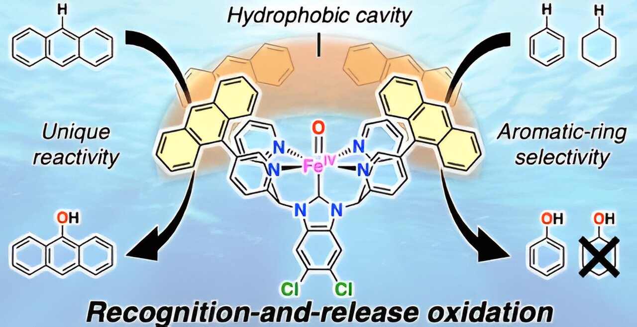 In this reaction, hydrophobic aromatic organic substrates are selectively recognized and trapped in the hydrophobic environment of iron complexes in water and hydrophilic oxidized products formed after oxidation are released into water. Based on this mechanism, they selectively oxidized hydrophobic aromatic substrates under mild conditions of 50°C in a two-phase system of aqueous solution and organic substrates using the iron complex.