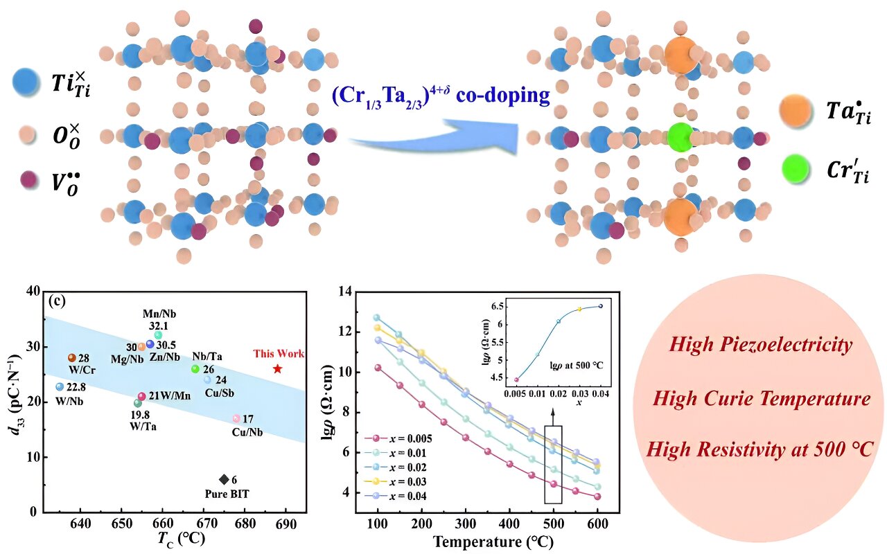 “Moreover, a significantly increased resistivity of 2.8×106 Ω·cm at 500 ℃ and good piezoelectric stability up to 600 ℃ are also obtained for this composition. All the results demonstrate that Cr/Ta co-doped BIT-based ceramics have great potential to be applied in high-temperature piezoelectric applications,” said Ms. Xuanyu Chen, the first author of the paper and a doctoral student in the School of Materials at Sun Yat-sen University.