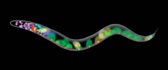Many neuroscientists use the unassuming nematode, a worm about a millimeter long, to study how whole brains work. This illustration shows the nematode’s neuroanatomy.