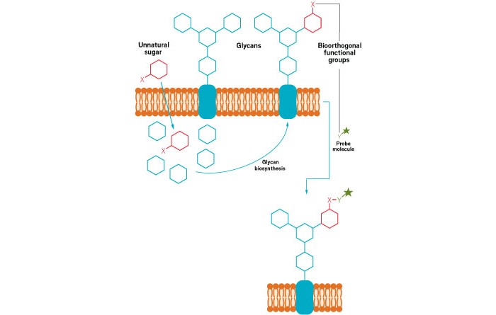 A strategy for imaging cell-surface glycans via metabolic labeling with a chemically modified sugar substrate (unnatural sugar) followed by bioorthogonal reaction with an imaging probe