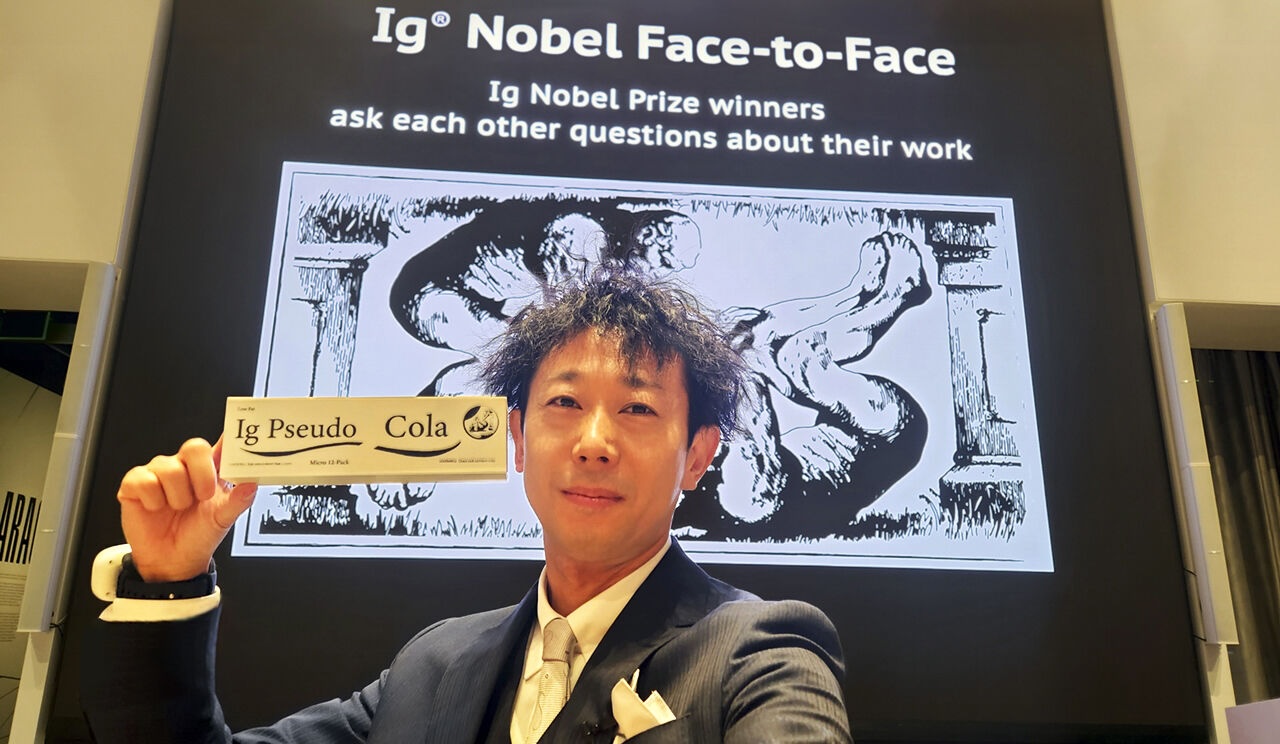 That Ig Nobel Prize was awarded to Homei Miyashita [show in the photo above] and Hiromi Nakamura, for experiments to determine how electrified chopsticks and drinking straws can change the taste of food.