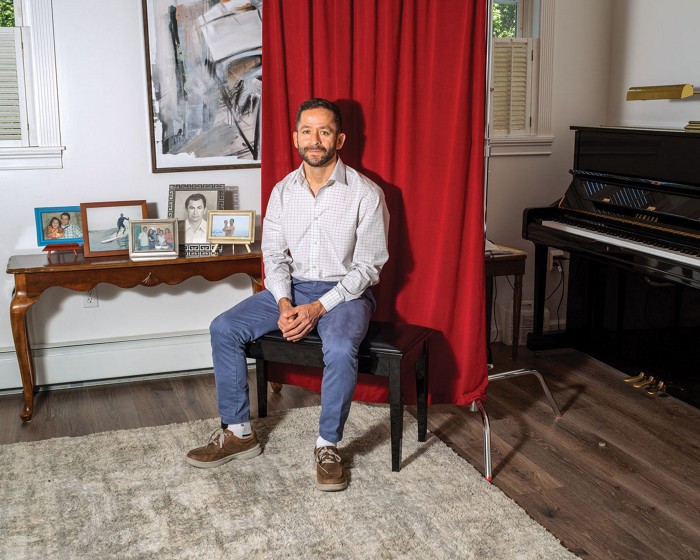 Carlos A. Martinez sits on a piano bench in front of a red curtain.