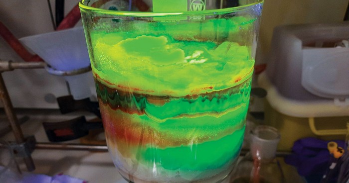 This silica plug glows green thanks to the fluorescent molecule that Anna Poryvai was filtering. Similar to a silica column, a silica plug—basically just a short, stout column of silica in a fritted funnel—enables chemists to quickly separate impurities from a reaction mixture. In this case, Poryvai—a postdoc at the Swiss Federal Institute of Technology, Lausanne (EPFL)—was synthesizing a fluorescent photocage molecule, a compound that falls apart into smaller molecules when it’s hit with certain wavelengths of light. One goal of the research is to make photocage molecules that break up and release drugs when irradiated. These photocages could be given to a person with, say, cancer so that when a doctor applies light to just the cancerous part of the person’s body, the photocage breaks down and delivers the drug molecule to the right place.