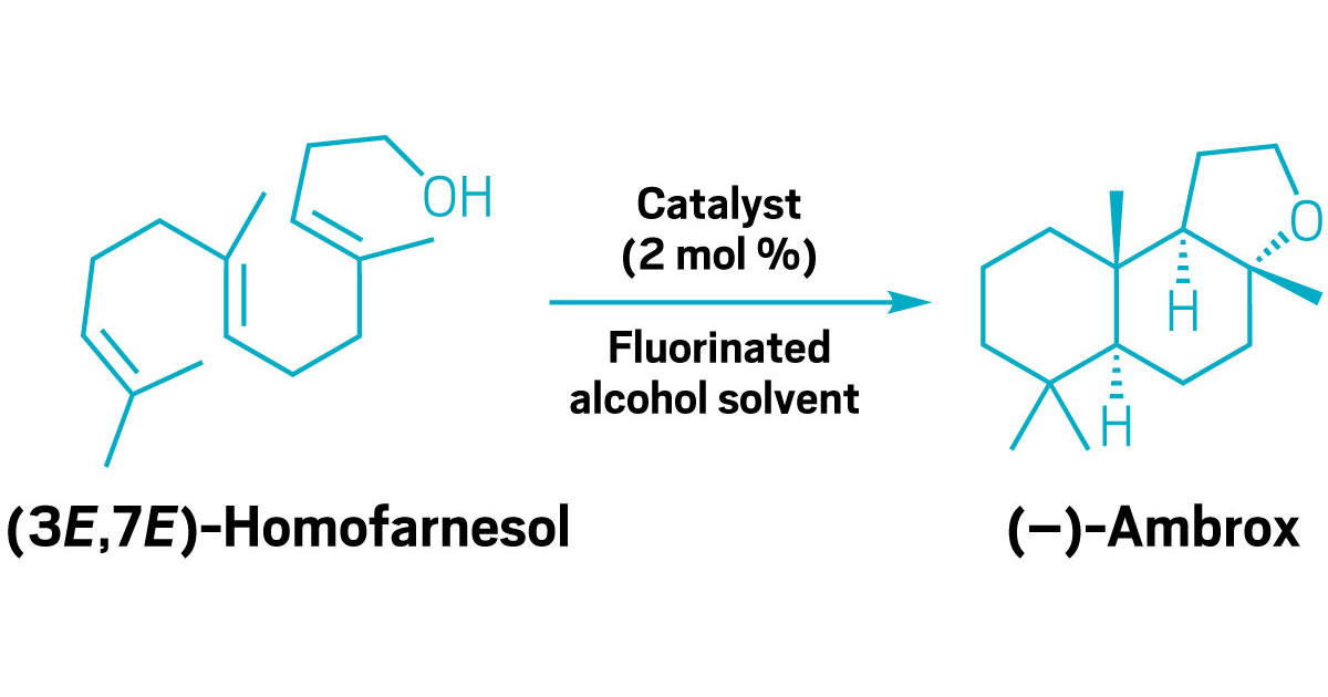 The synthesis uses a chiral imidodiphosphorimidate catalyst, which possesses an enzyme-like microenvironment. This catalyst coaxes (3E,7E)-homofarnesol into the perfect position to become (–)-ambrox upon protonation. List says using a fluorinated alcohol solvent was key to the reaction’s success because it helped boost the ionizability of the reactants. The use of fluorinated solvents raises environmental concerns, but Mathias Turberg, a graduate student in List’s lab, says it was easy to recover and recycle the solvent.