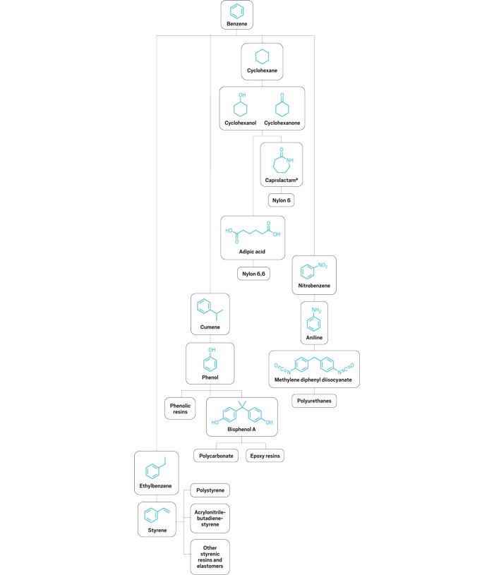 Benzene is the starting point for familiar products such as nylon and polystyrene.