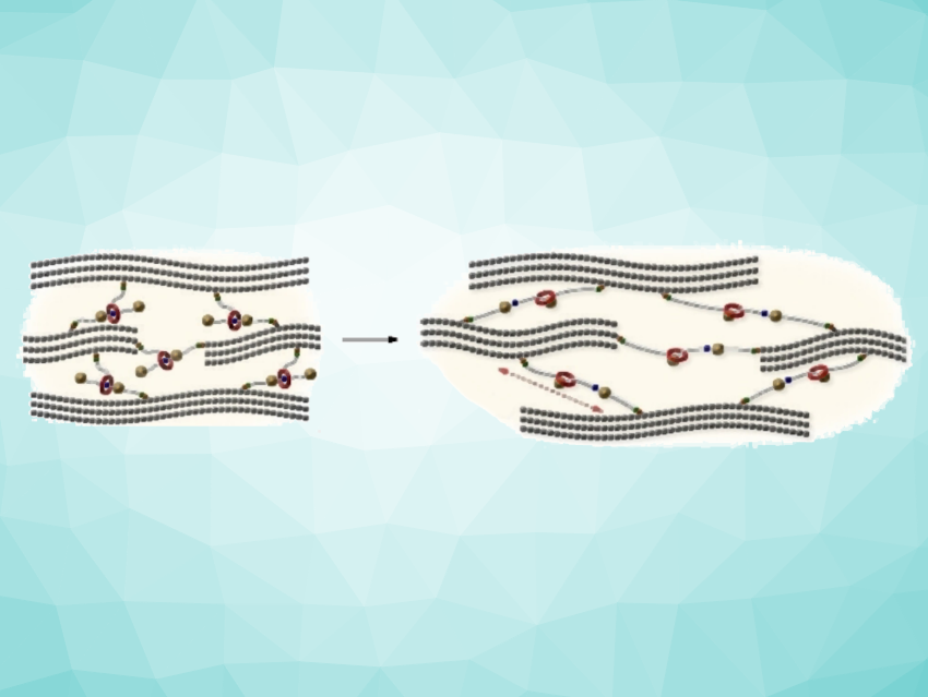 The team used a new approach: They cross-linked graphene nanolayers with mechanically interlocked molecules whose building blocks are not chemically linked, but rather inseparably spatially entangled. The researchers chose to use rotaxanes as their links. A rotaxane is composed of a “wheel” (a large ring-shaped molecule) that is threaded onto an “axle” (a molecular chain). Bulky groups cap the axles to prevent the wheels from coming unthreaded.