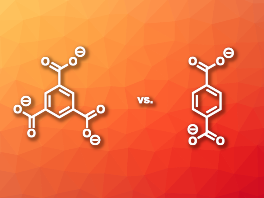 Francesco Capitani, Synchrotron SOLEIL, Saint-Aubin, France, and colleagues have studied the high-pressure behavior of the mesoporous MOF MIL-100(Cr), which consists of trimeric chromium oxide building blocks linked by the tritopic linker 1,3,5-benzenetricarboxylate (BTC), and compared it to the MOF MIL-101(Cr), which is a similar framework with the ditopic linker 1,4-benzenedicarboxylate (BDC, both linkers pictured). The team prepared MIL-100(Cr) via a hydrothermal synthesis from trimesic acid and CrO3. They investigated the behavior of MIL-100(Cr) under high pressures in a diamond anvil cell using synchrotron X-ray diffraction (XRD) and infrared (IR) spectroscopy. They used both solid and fluid pressure-transmitting media, i.e., NaCl or CsI as solids and polydimethylsiloxane (PDMS) as a fluid.