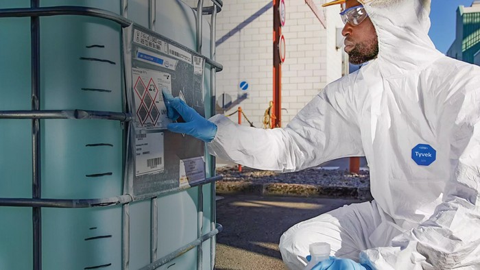 A worker wearing a Tyvek suit is inspecting a label.