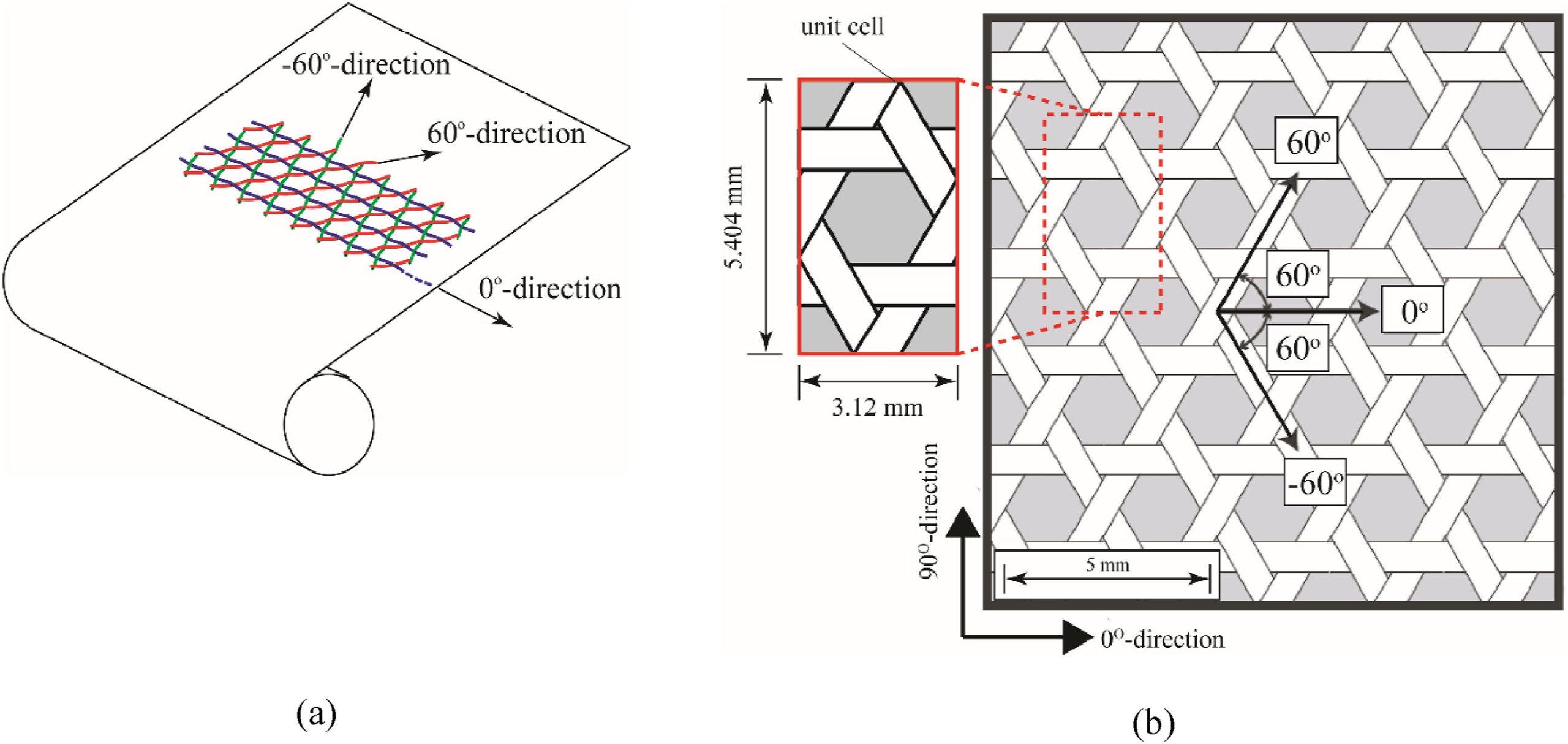 (a) Illustration of the TWF roll, displaying the main directions of the yarns (b) SK-802 TWFC and the extracted unit cell. Credit: Heliyon (2023). DOI: 10.1016/j.heliyon.2023.e17631