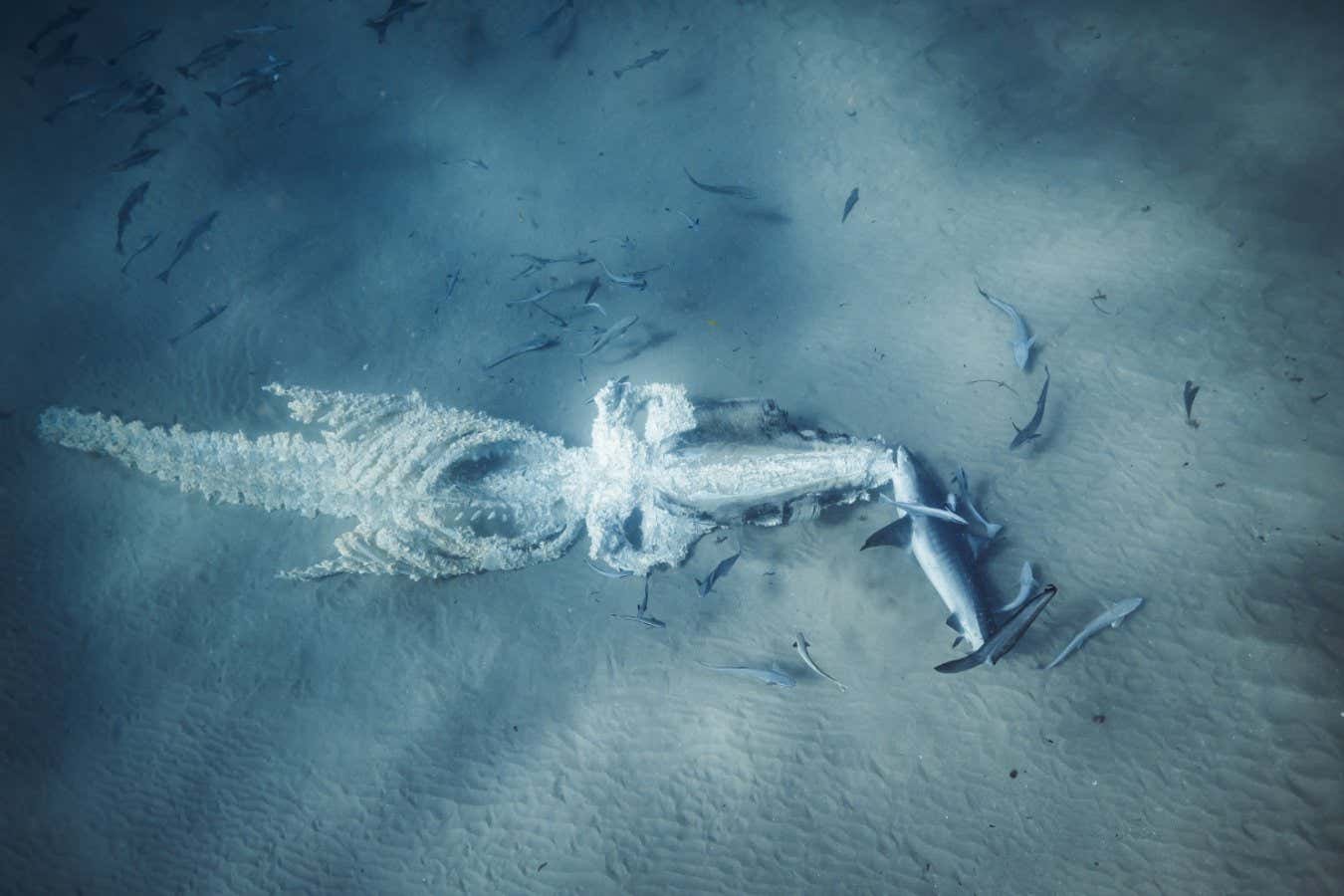 Whale remains being eaten by a tiger shark and other scavengers on the seabed