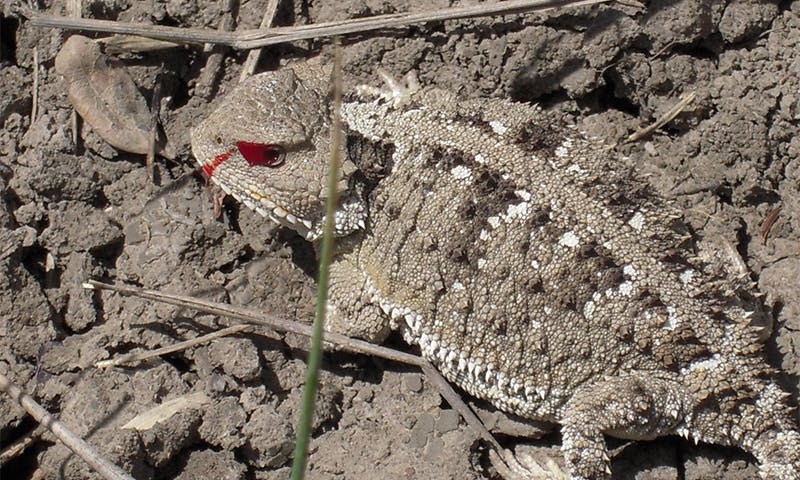 Horned lizards can shoot jets of blood from their eye sockets in self-defense against predators. The lizards contract the muscles lining the veins around the eyes abruptly, resulting in increased pressure that helps in the formation of jets. These blood jets or squirts can travel up to a distance of around 3 feet, and contain chemicals that are toxic to dogs, wolves, and coyotes.