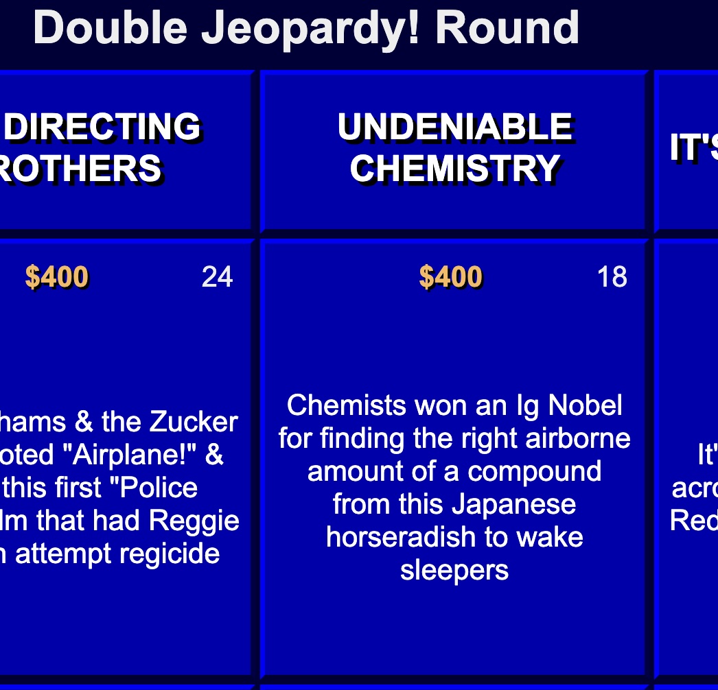 This week the Ig Nobel Prizes made another appearance on the Jeopardy! TV game show, this time as an answer. It refers to the 2011 Ig Nobel Chemistry Prize, which honored the inventor who tried to determine the ideal density of airborne wasabi (pungent horseradish) to awaken sleeping people in case of a fire or other emergency, and who applyied this knowledge to invent the wasabi alarm.