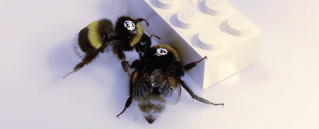 As you can see in the video below, a bumblebee waits for its training partner to arrive before the two insects proceed to move the Lego block to slurp up their sugar water reward.