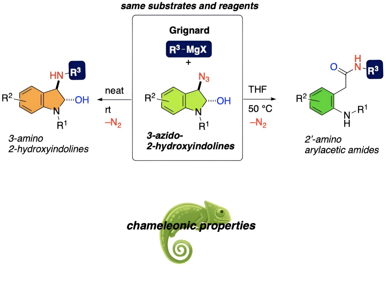 They developed a switchable process for of 3-aminoindolines and 2′-aminoaryl acetic acids from the same substrates in the presence of Grignard reagents. The researchers realized that combining nitrogen-containing moieties like azidoindolines and hemiaminals as precursors could ensure controllable coupling due to their “chameleonic character.”