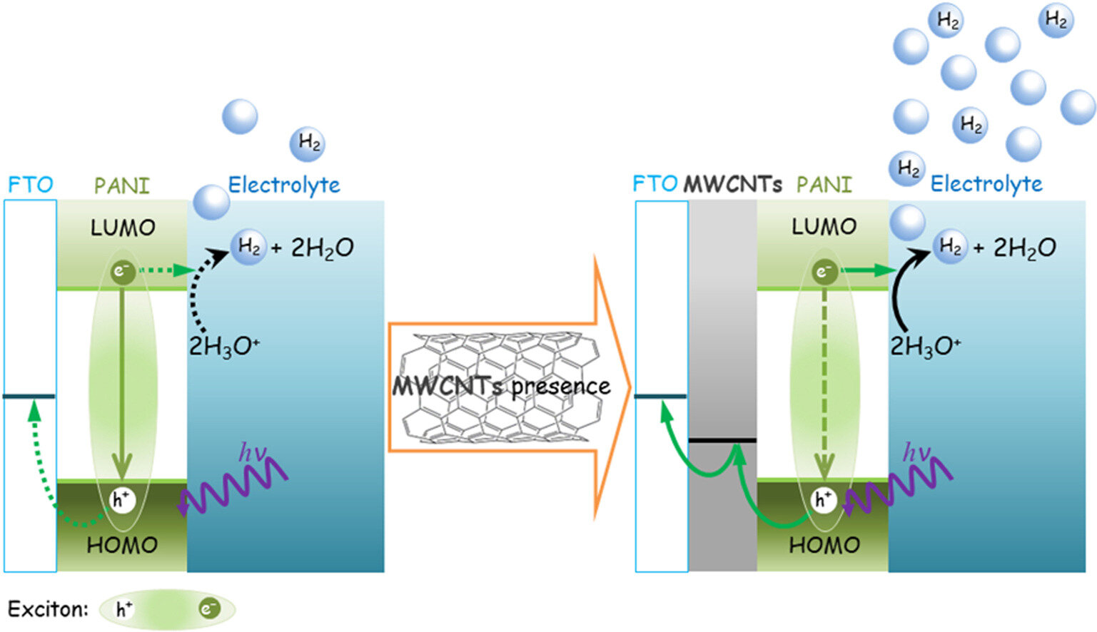 The article describes the preparation of films comprising polyaniline nanostructures with an underlayer of multi-walled carbon nanotubes and their promising photoelectrocatalysis performance, especially in H2 production, which requires good light absorption and enhanced stability, among other characteristics.