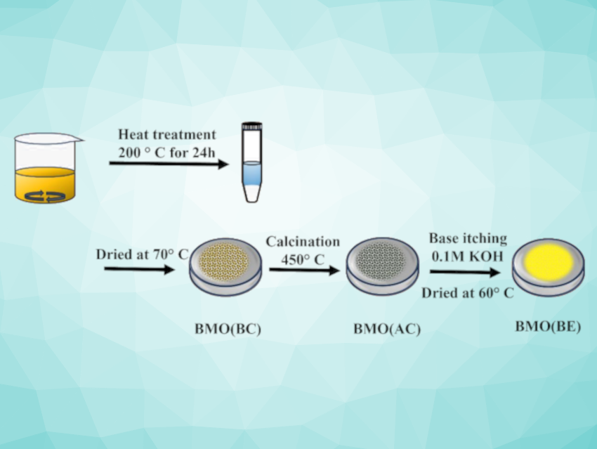 The researchers first reacted bismuth(III) nitrate pentahydrate with ammonium molybdate in the presence of hexamine in ethylene glycol at 200 °C. The product was separated using centrifugation and dried at 70 °C. The resulting product—BMO (BC) for “before calcination”—was calcined at 450 °C to give the modified form BMO (AC). In addition, a base-etched form, BMO (BE), was obtained by treating BMO (AC) with a KOH solution.