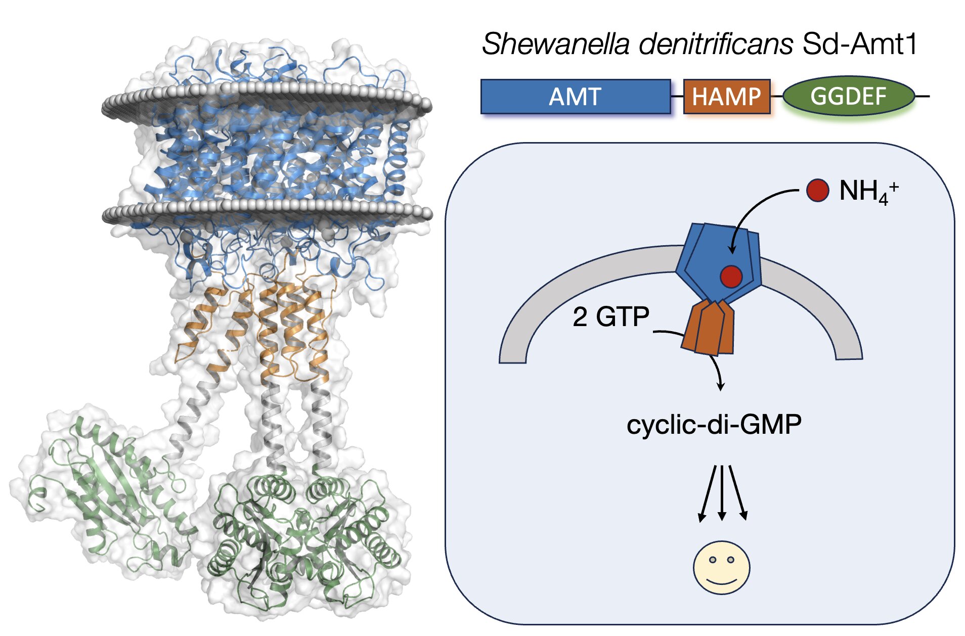 The newly discovered protein Sd-Amt1 utilizes ammonium cations as extracellular signals to increase the cytoplasmic level of the secondary messenger cyclic-di-GMP. It consists of a membrane-integral ammonium receptor domain linked to a cytoplasmic diguanylate cyclase transducer module.