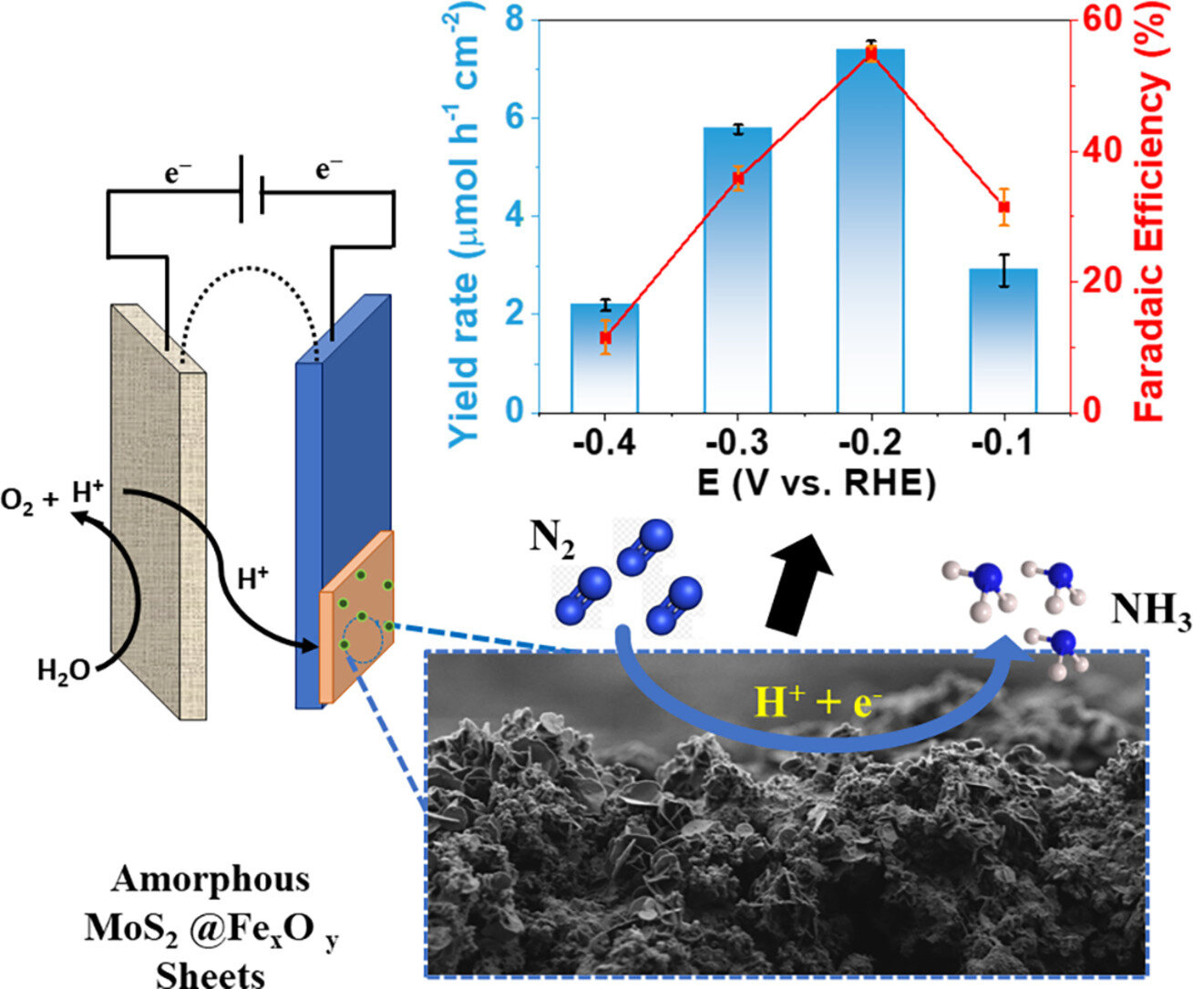 Caio V.S. Almeida et al, Enhancing electrochemical N2 reduction at mild conditions with FexOy co-deposited on amorphous MoS2, Electrochimica Acta (2023). DOI: 10.1016/j.electacta.2023.143680