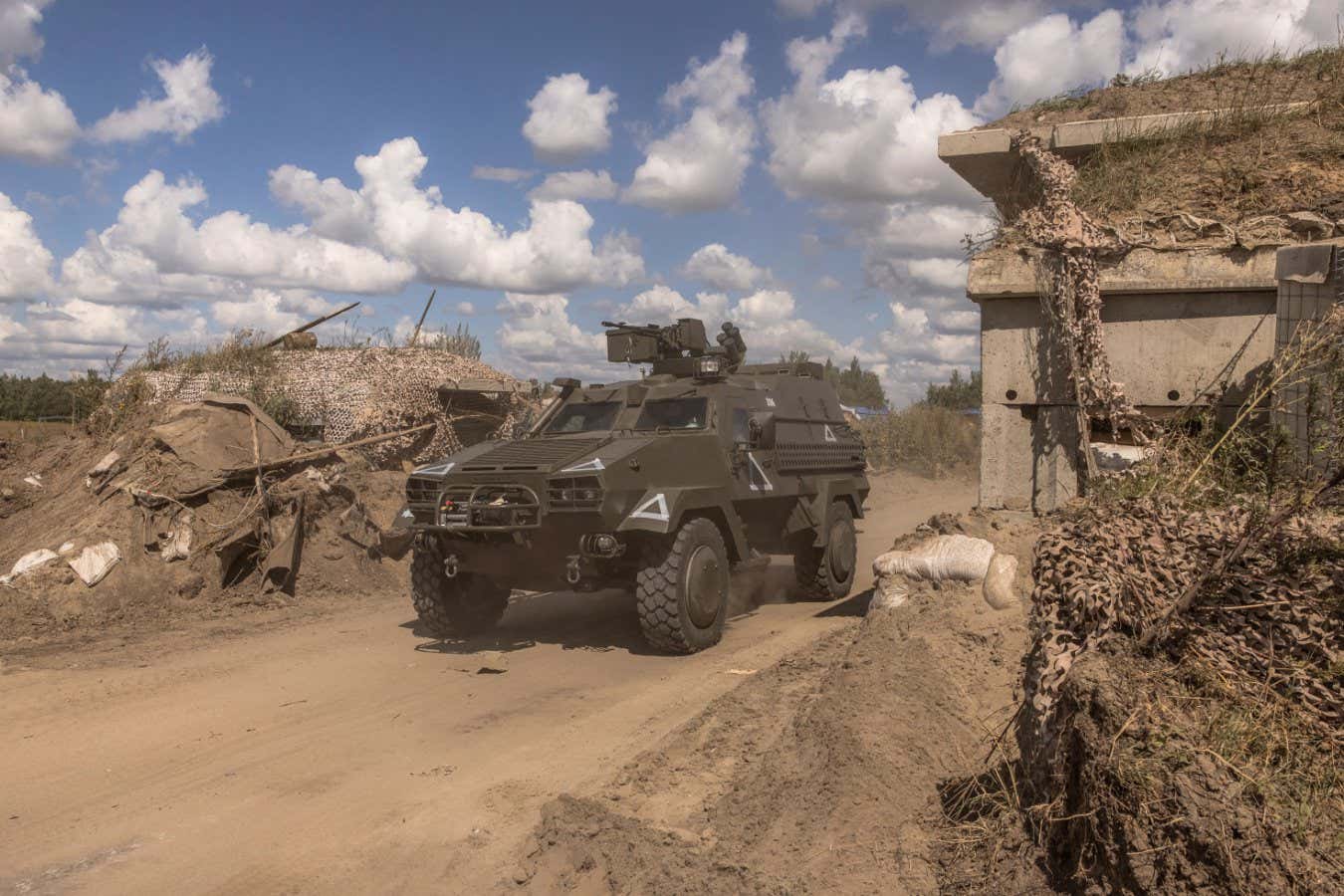 A Ukrainian military vehicle driving passing a destroyed border crossing point with Russia, in the Sumy region, 14 August