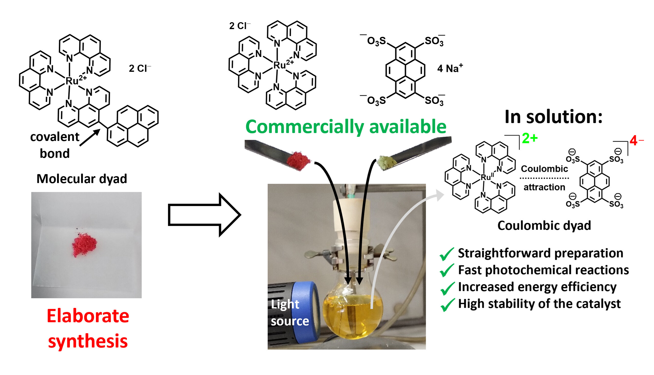 Tailored photocatalysts with outstanding efficiencies in photocatalytic applications are oftentimes composed of two photoactive units with a covalent bond in-between. These so-called molecular dyads have to be prepared in a multi-step synthesis, which is why they would be too expensive for large-scale applications.