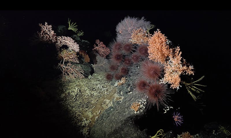 Lead photo: Several different kinds of corals are illuminated by the submersible’s beams. Their bodies provide habitat and protection for many other creatures, including these cactus urchins, and their colonies are the foundation of entire seamount assemblages. Credit: ROV SuBastian / Schmidt Ocean Institute.
